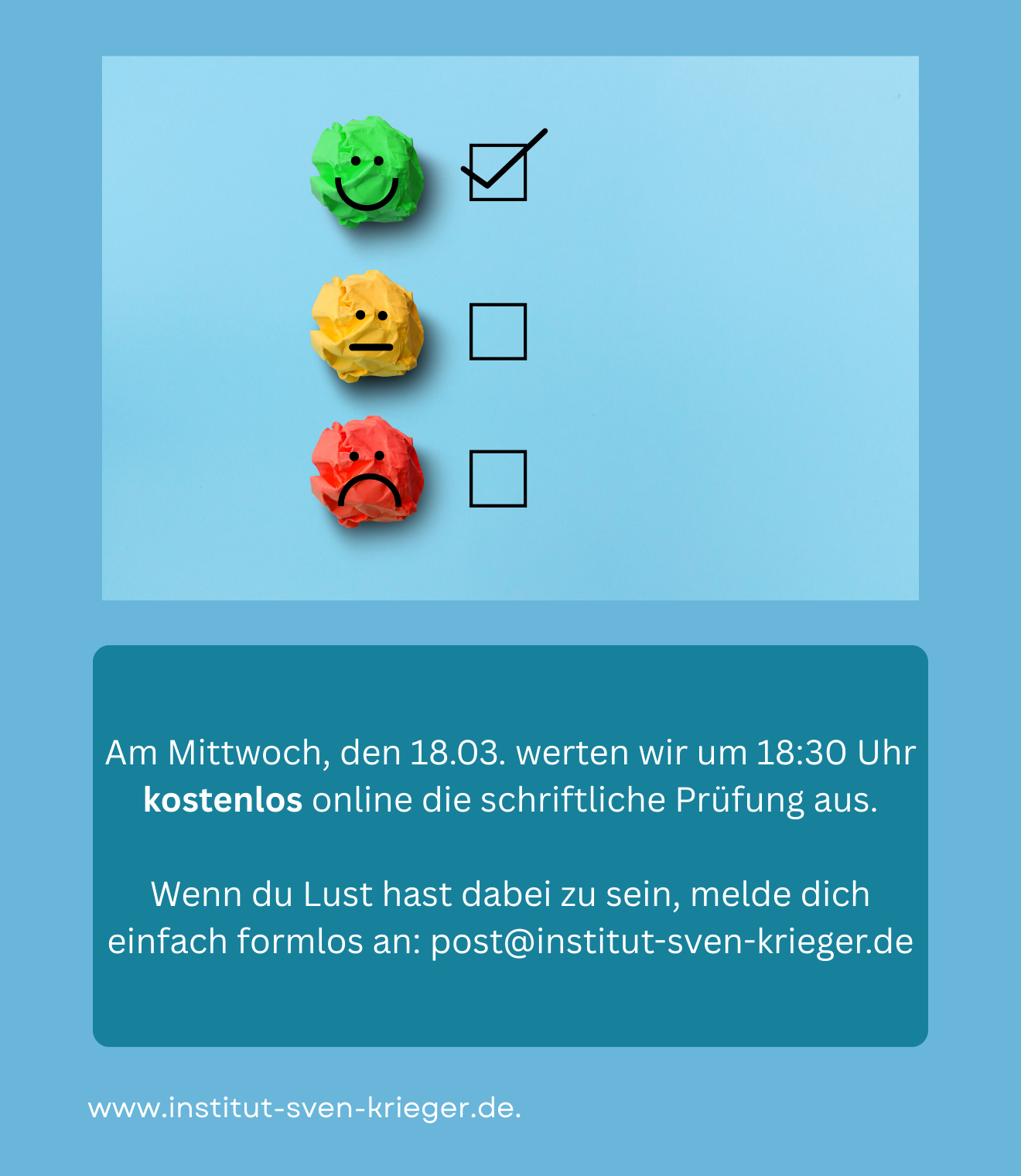 Am Mittwoch, den 18.03. um 18:30 Uhr, werten wir die schriftliche Prüfung kostenlos online gemeinsam aus. Dabei gehen wir Schritt für Schritt die Aufgaben durch, erklären die Lösungen und beantworten deine Fragen.